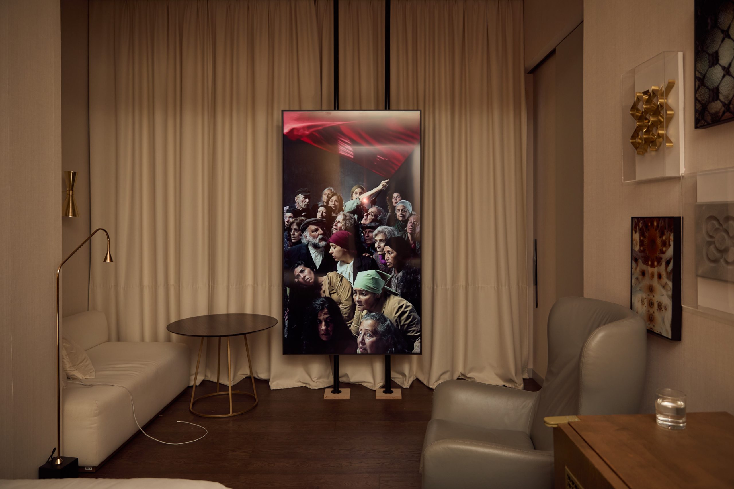 Una mica atabalat per la gran afluència de la fira, entro a l’habitació 215, que en aquell moment està buida. Hi trobo una gran pantalla vertical on es projecta Rebeliones de Gabriela Golder (2022, Rolf Art). És una estampa pictòrica a mode de tableau vivant on un grup de persones, enmig del que sembla una revolta, s’aplega sota la bandera vermella dels moviments obrers. La bandera oneja lentament, la il·luminació ressalta les expressions dels rostres, els gestos de la gent. D’entrada penso en Delacroix i en el llinatge iconogràfic de la seva Llibertat guiant el poble (1830), però ara ja sé que al rebedor de cada estança hi ha un full d’instruccions amb una descripció detallada del concepte; en aquest cas em fa saber que l’obra de Golder és una reinterpretació de la litografia La internacional (Guillermo Facio Hebequer, 1935).